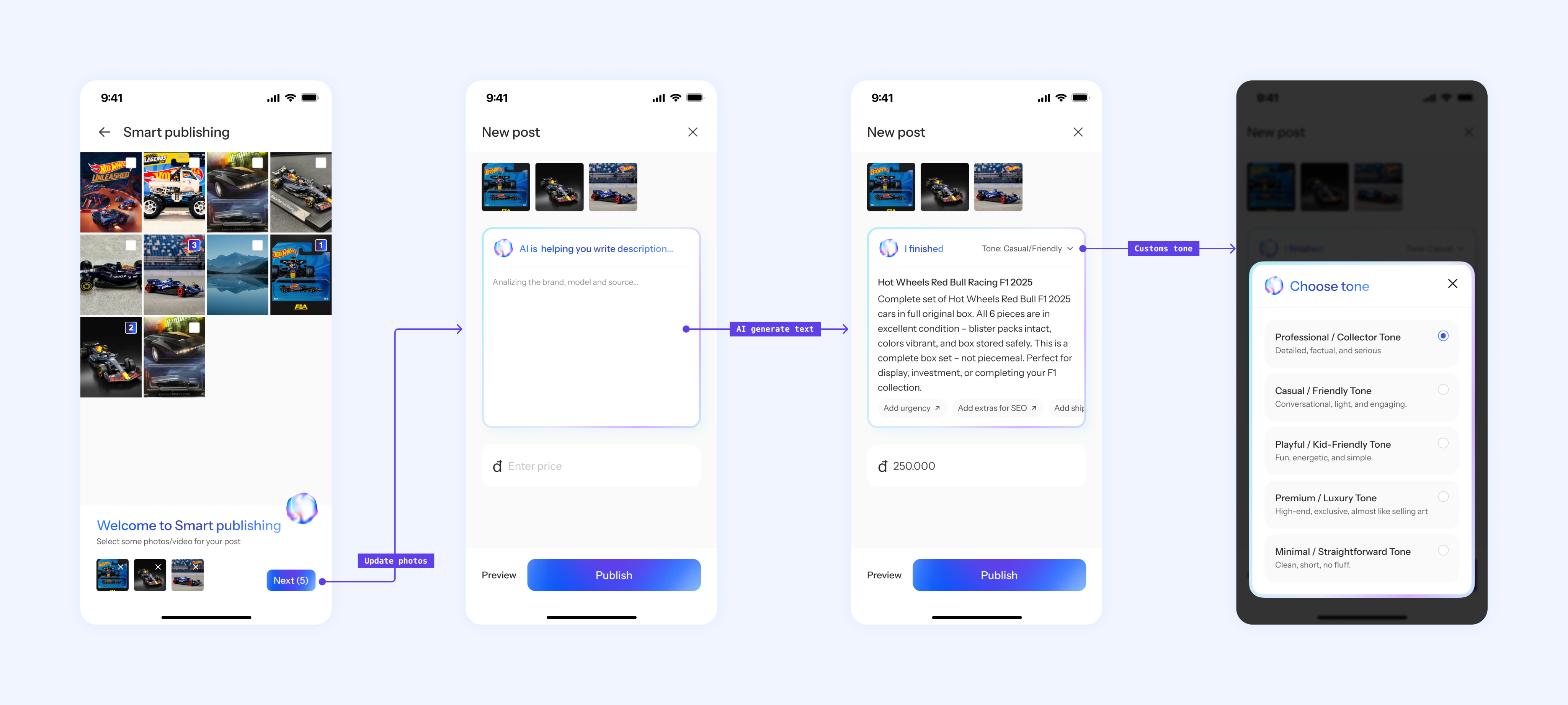 Smart Publishing helps marketplace sellers create high-quality product descriptions from the photos they’ve already taken. Select your images, pick a tone, and get a ready-to-post description with clear highlights and search-friendly phrasing. It’s faster, easier, and more consistent—so you spend less time writing and more time selling.